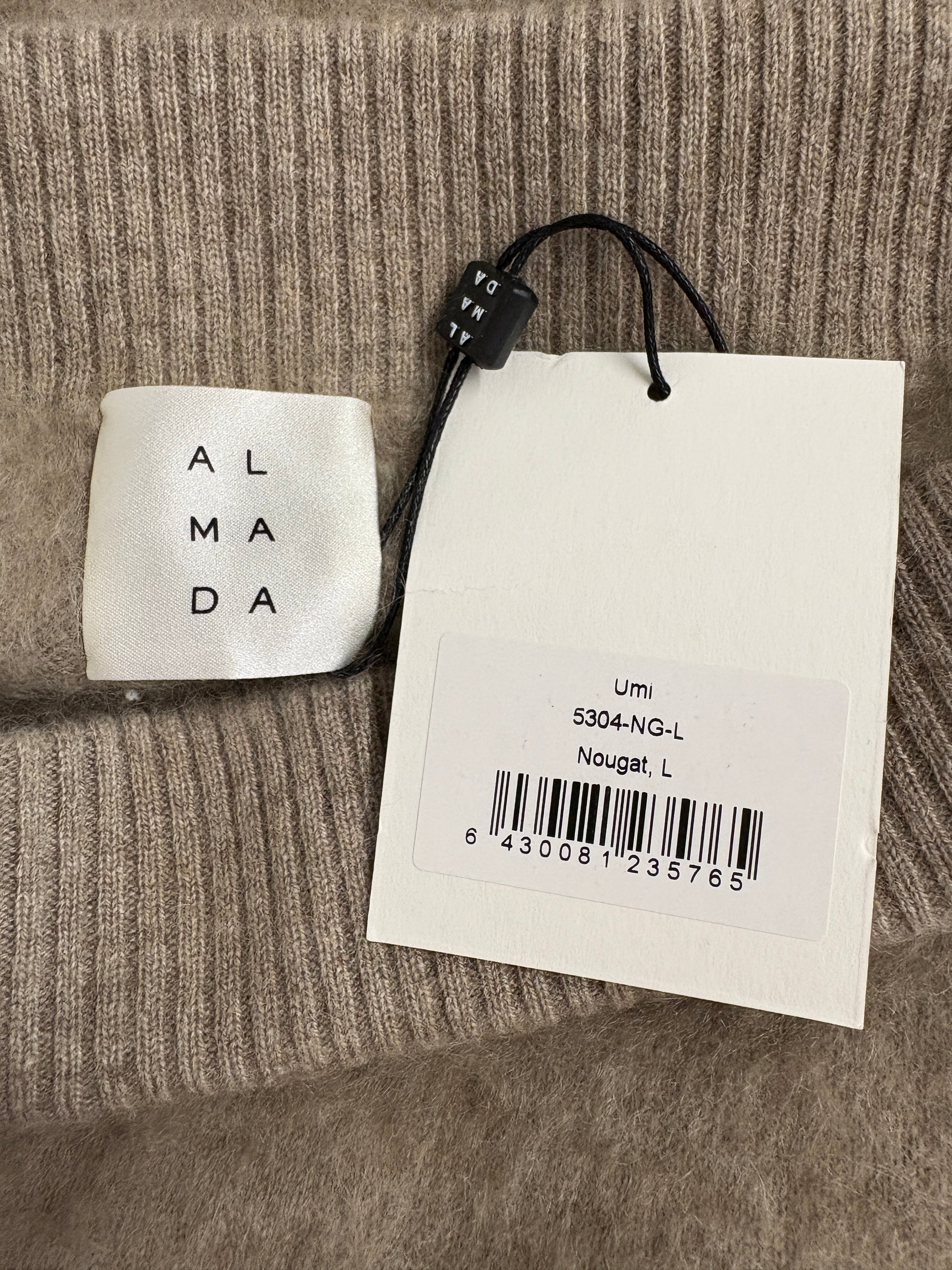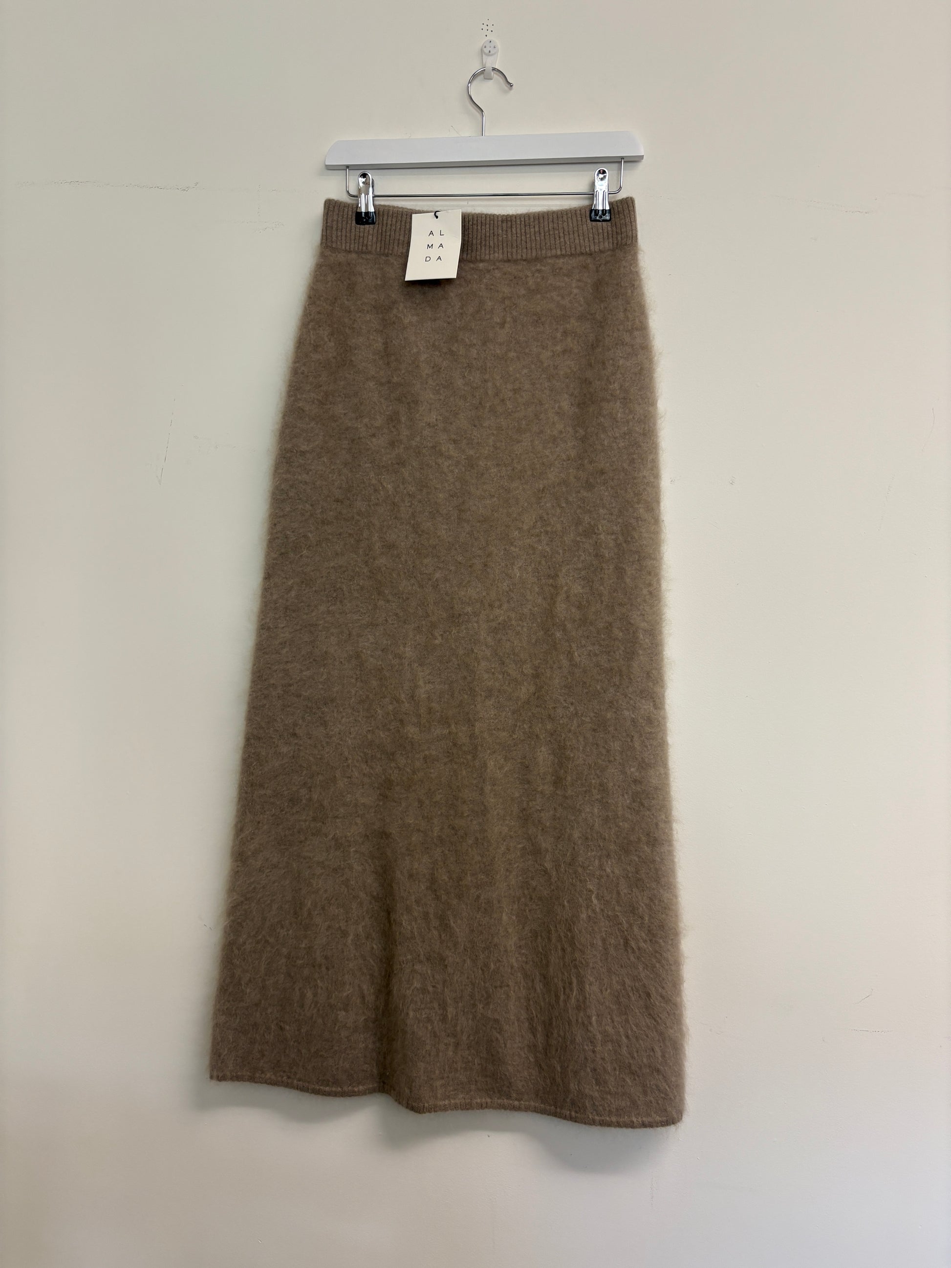The Umi Brushed Cashmere Skirt in Nougat offers a cozy and versatile option for your wardrobe. With its subtle A-line silhouette, ribbed waistband, and wide hem, it provides a flattering fit and comfortable wear. The maxi-length design allows for versatile styling and can be easily dressed up or down.