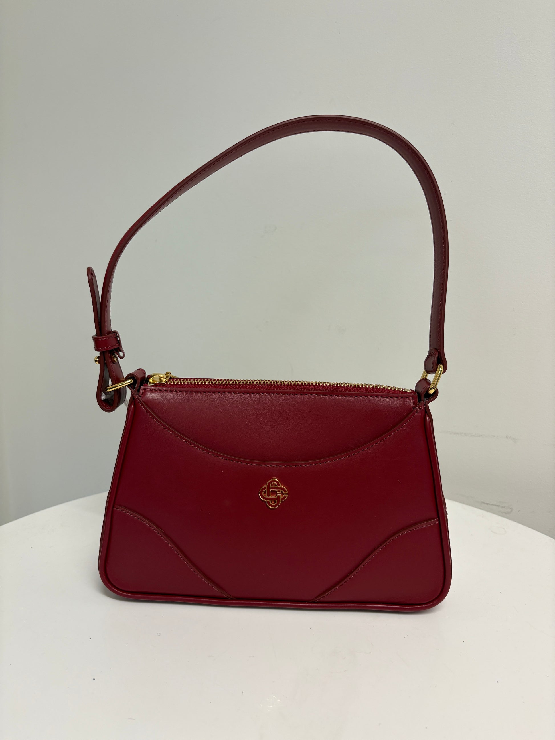 The red Jeanne pochette shoulder bag is crafted from Italian calf leather, adorned with the house's interlocking CC logo on high-quality, gold-plated metal hardware. Completed with a top zip closure featuring the house's red diamond monogram, a shoulder length strap, two main compartments, canvas lining and an internal slip pocket.