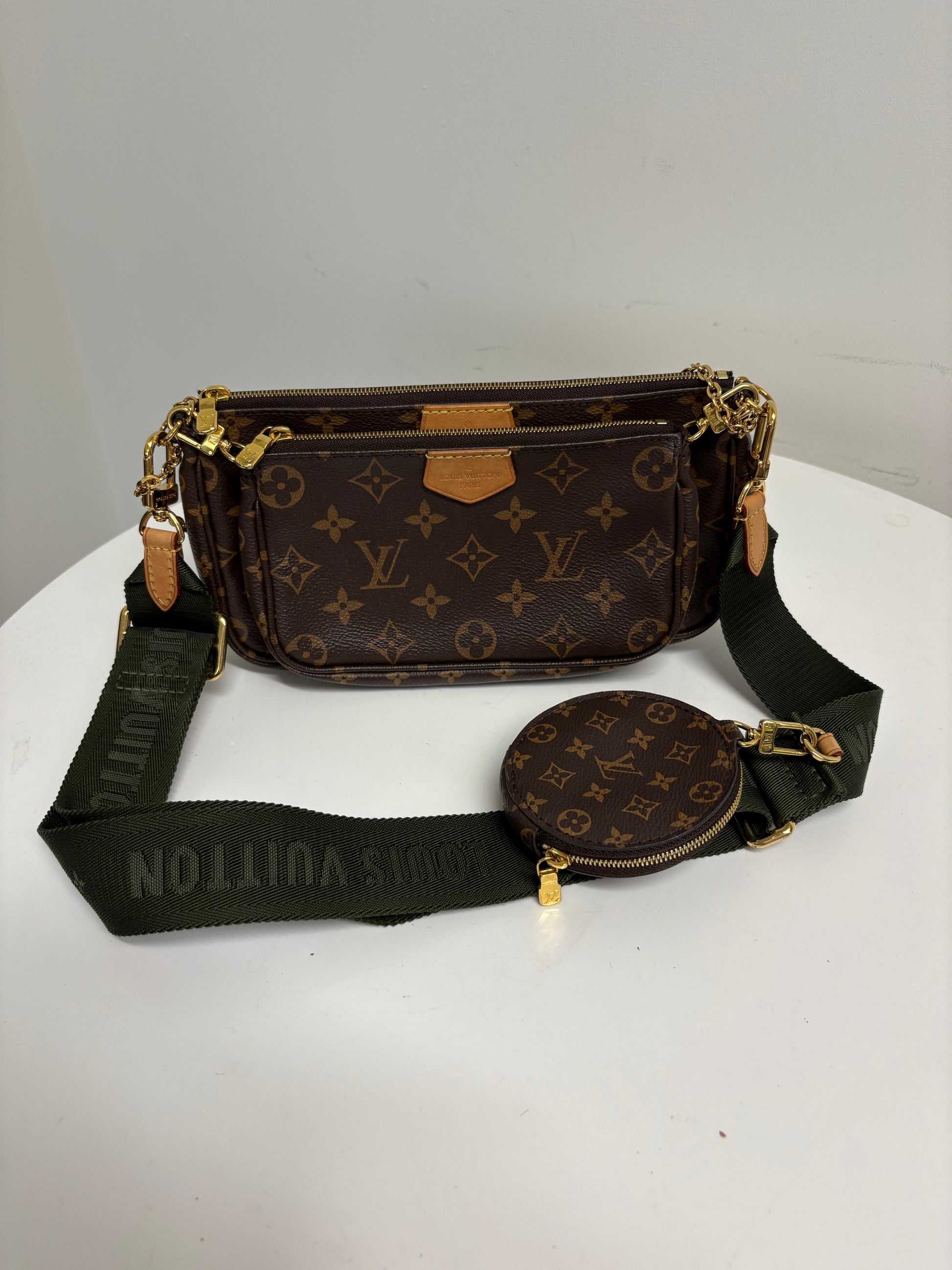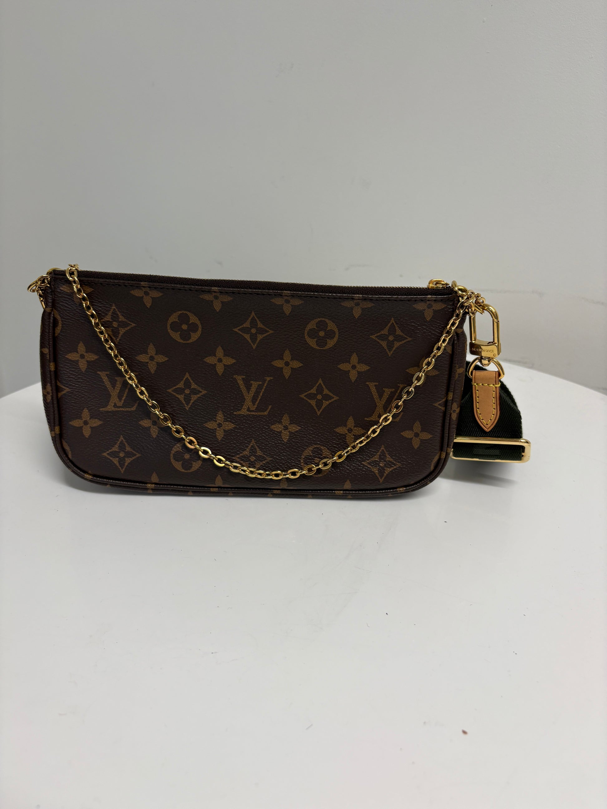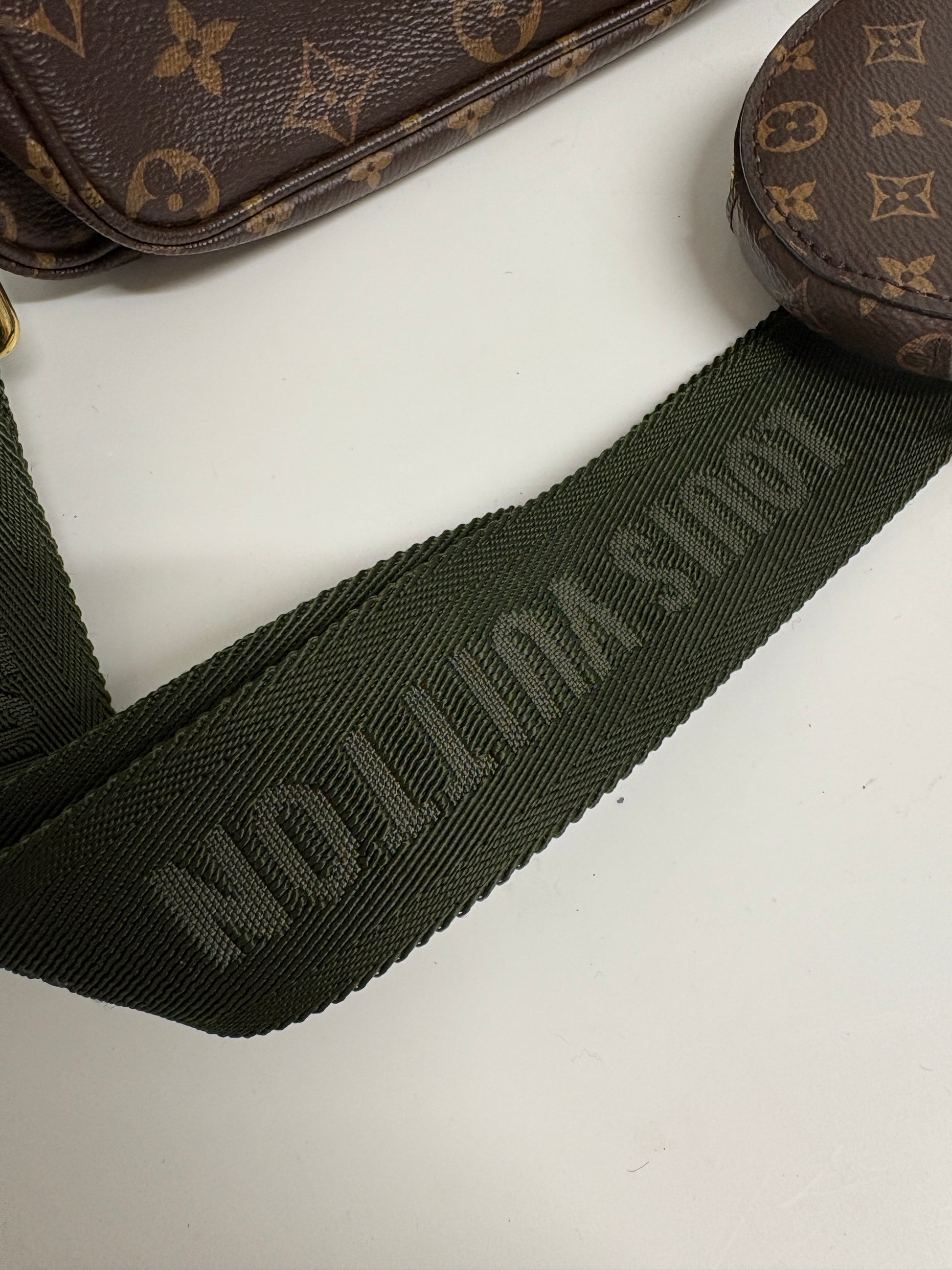 This Louis Vuitton Multi Pochette set in Khaki Monogram canvas is a modular must-have. With its detachable pouches, chain, and wide Jacquard strap, it offers playful styling and hands-free utility.