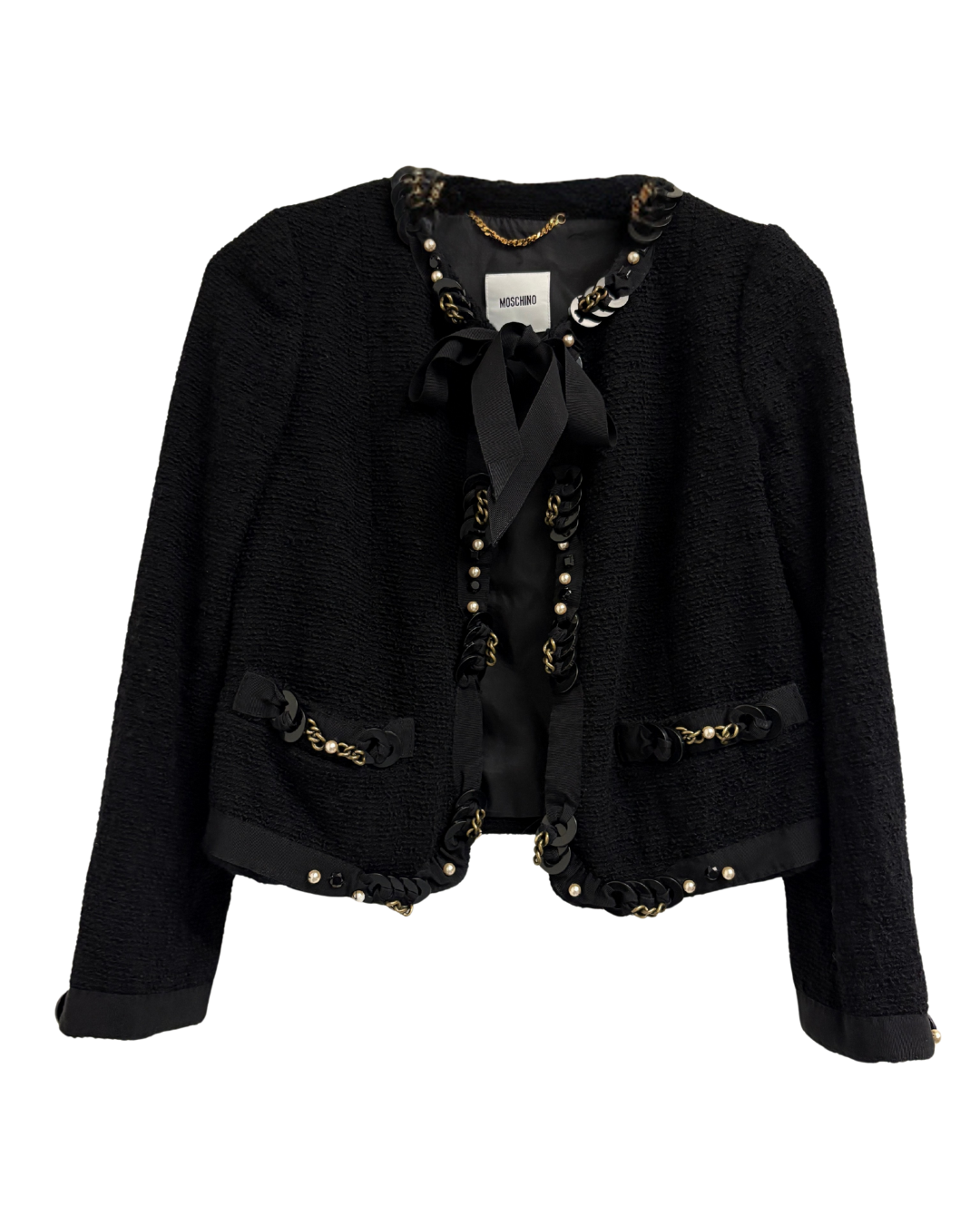 Moschino Black Chain And Pearl Embellished Short Wool Jacket