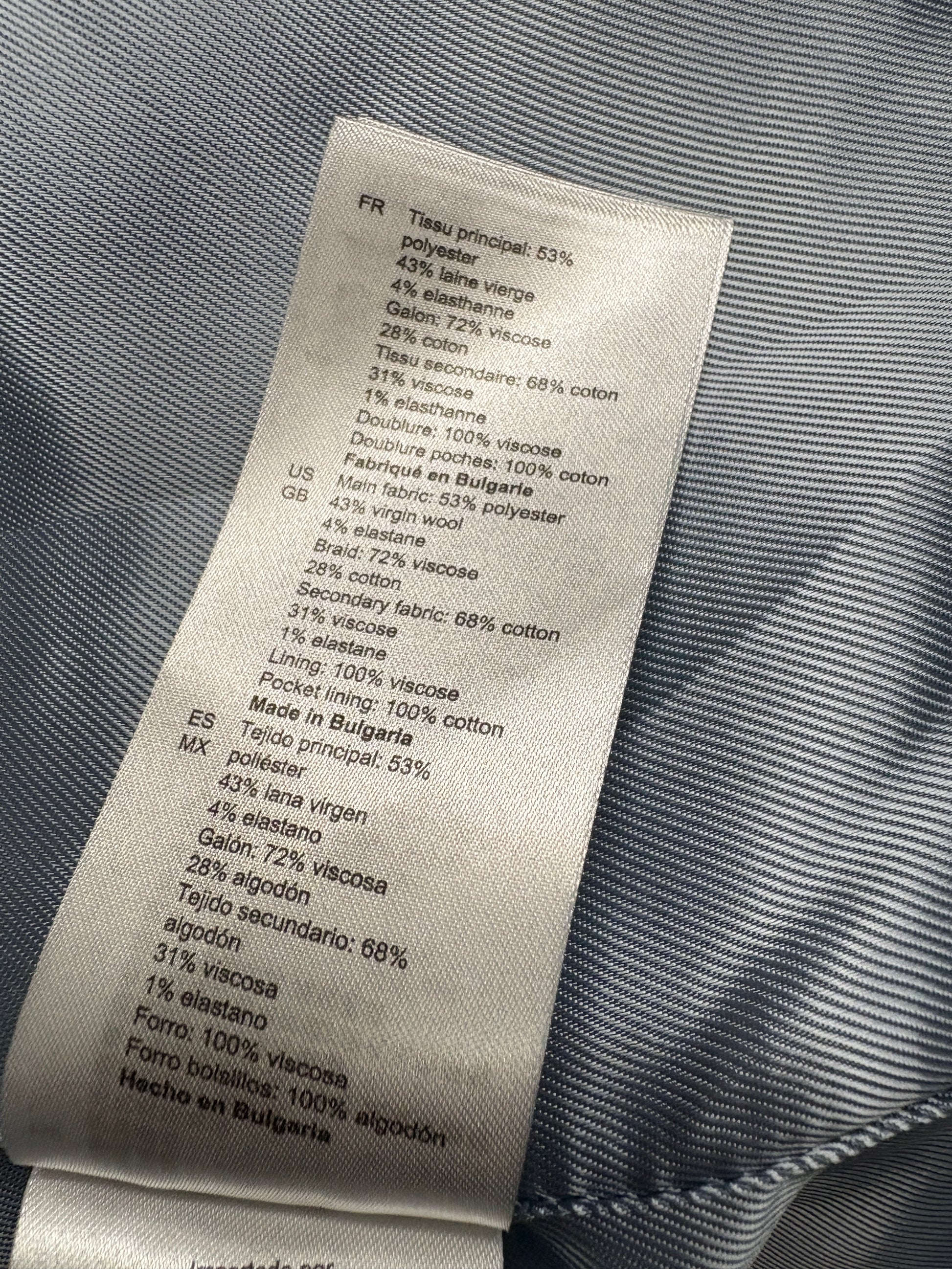 Button fastening, shawl lapel with velvet trim, single-breasted silhouette, concealed button, long sleeves, piped flap pockets, fully lined