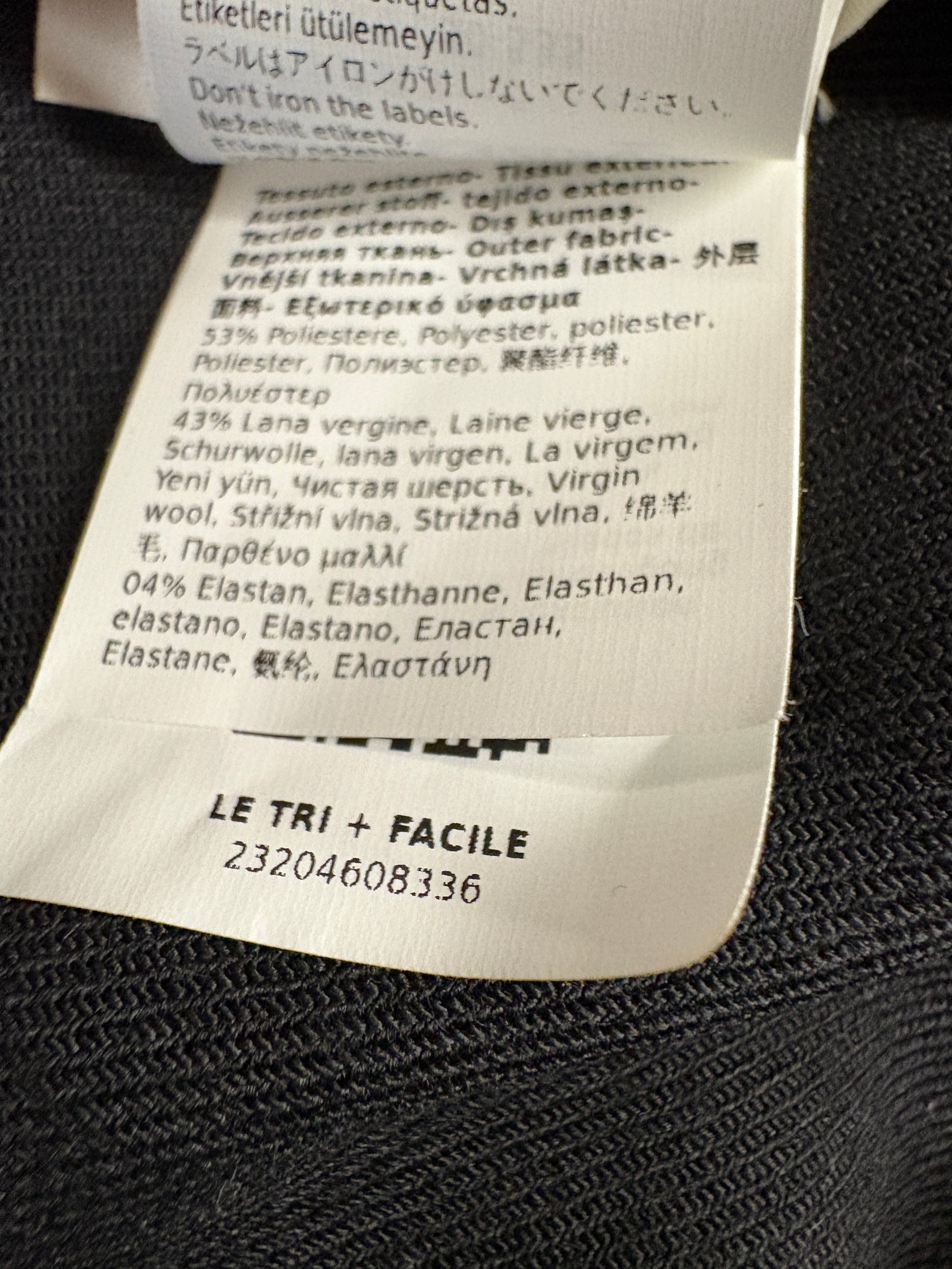 53% polyester, 43% virgin wool, 4% elastane